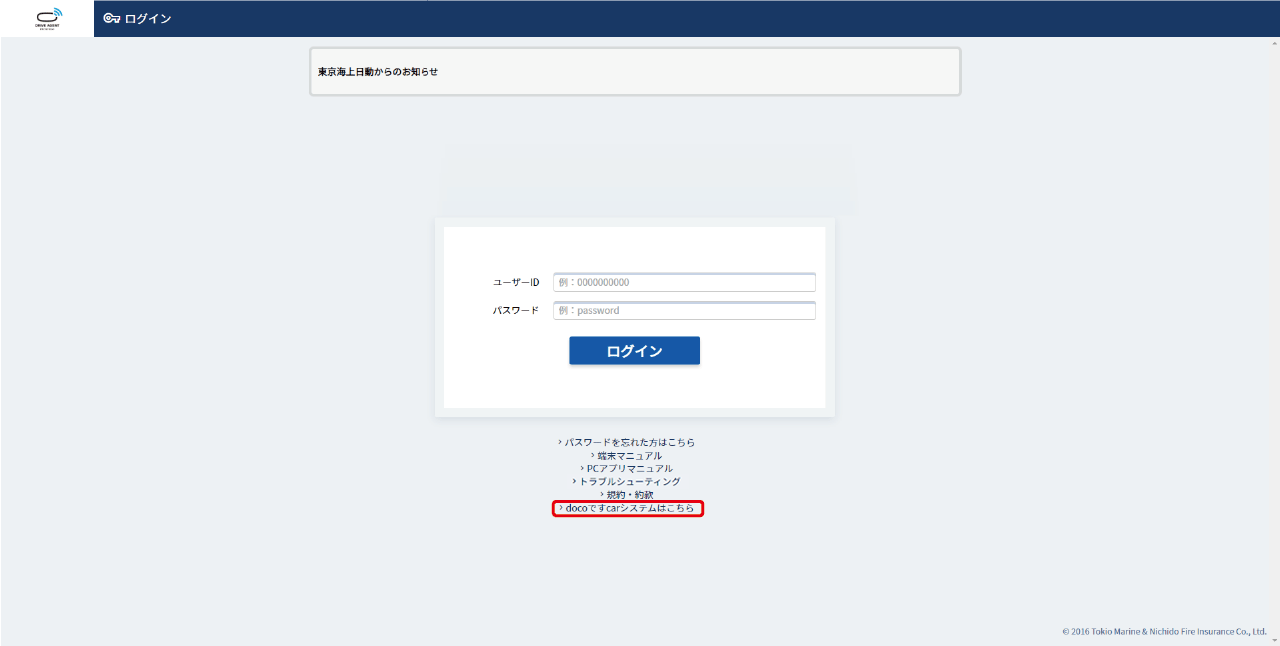 docoですcarシステムのログイン画面を表示する アルコールチェッカーシステムの「docoですcar」のログイン画面を表示します。 ログイン画面で【docoですcarシステムはこちら】をクリックします。 docoですcarシステムのログイン画面が表示されます。
