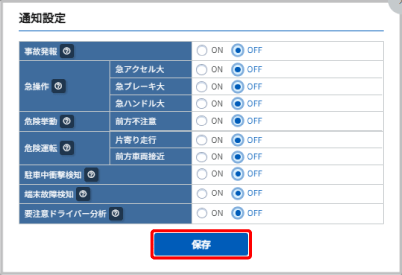通知の種類 通知タイミング 事故発報 メール通知登録後、すぐに 急操作(急アクセル大、急ブレーキ大、急ハンドル大) 一日1回、まとめて 危険挙動(前方不注意*) *: わき見と居眠り