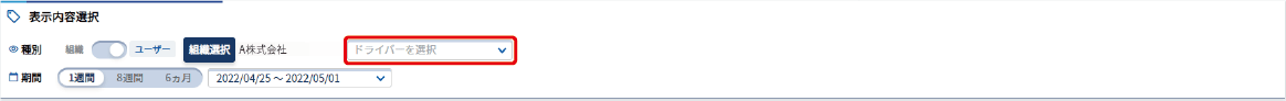 ドライバーを選択する 運転状況概要を表示するドライバーを選択することができます。 運転状況概要画面のユーザー画面(ユーザー画面に切り替える)で表示内容選択の【ドライバーを選択】をクリックします。 ドライバー一覧画面からドライバーを選択します。