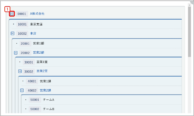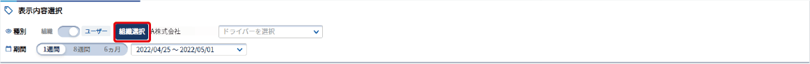 組織を選択する 運転状況概要の結果を表示する組織を選択することができます。 運転状況概要画面のユーザー画面(ユーザー画面に切り替える)で表示内容選択の【組織選択】をクリックします。 組織一覧画面から組織を選択します。 No. 項目 内容 +/- ボタン +ボタンをクリックすると、下の階層が表示されます。-ボタンをクリックすると、表示している階層を閉じます。
