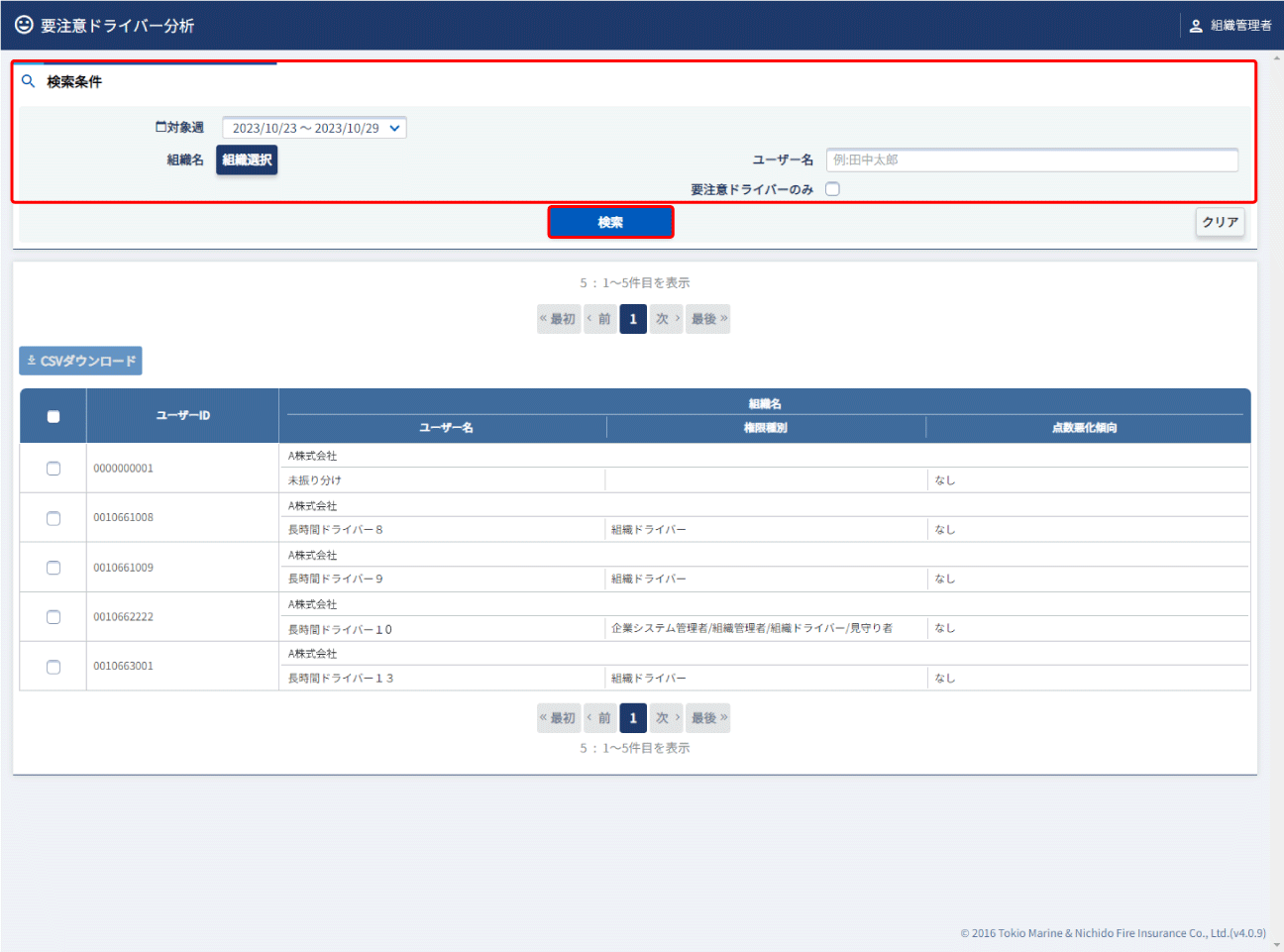 要注意ドライバー分析画面(要注意ドライバー分析画面を表示する)で、検索条件を入力し、【検索】をクリックして一覧を絞り込みます。
