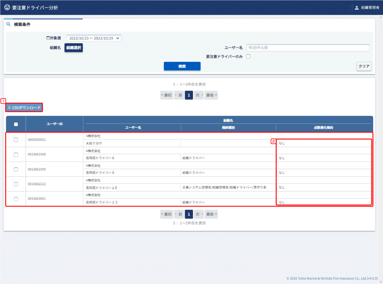 CSVダウンロード 選択したユーザーの要注意ドライバー分析結果をCSVファイルでダウンロード