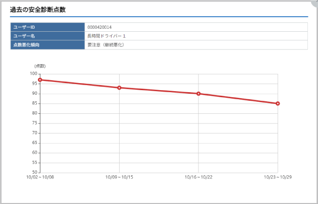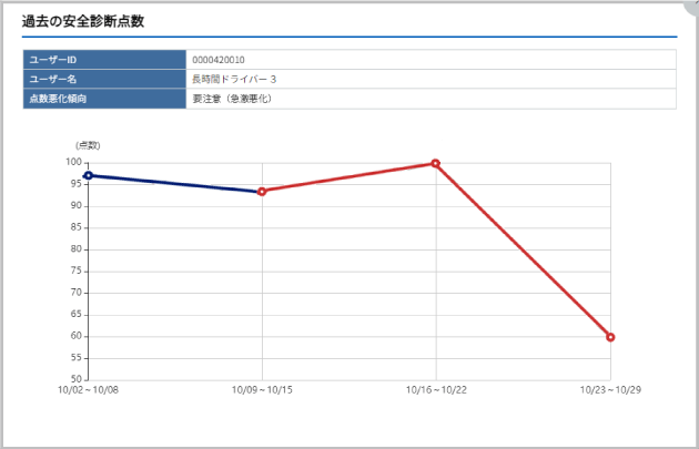 点数悪化傾向 - 継続的な悪化が判定された場合、「要注意(継続悪化)」と表示され、グラフでは全体を赤で表示します。