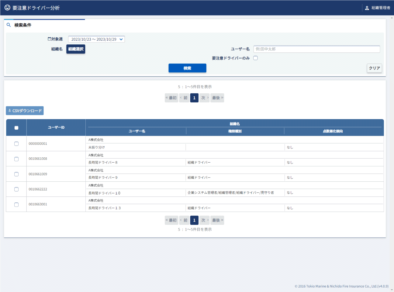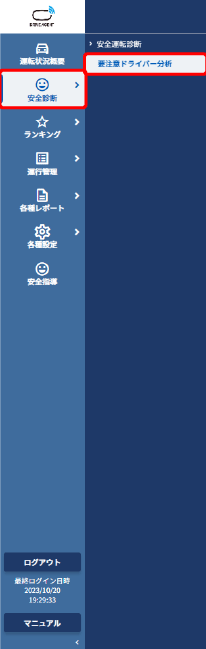 要注意ドライバー分析画面を表示する 安全運転診断から悪化傾向を分析し、継続悪化・急激悪化などの判定結果を表示します。 左メニューの【安全診断】の中の【要注意ドライバー分析】をクリックします。 要注意ドライバー分析画面が表示されます。