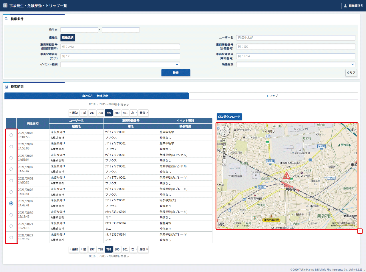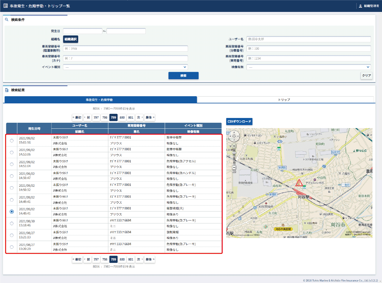 行をクリックすると、事故発生・危険挙動詳細画面が表示されます。