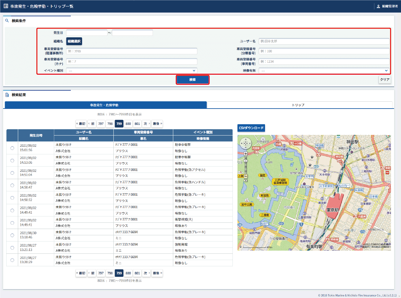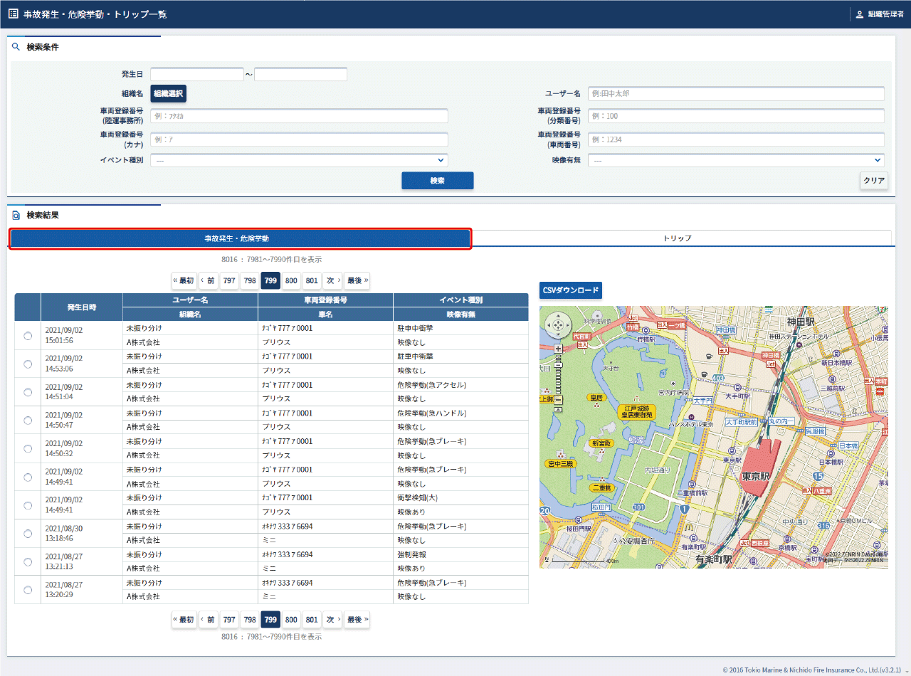 事故発生・危険挙動・トリップ一覧画面(事故発生・危険挙動・トリップ一覧画面を表示する)で【事故発生・危険挙動】のタブを選択します。