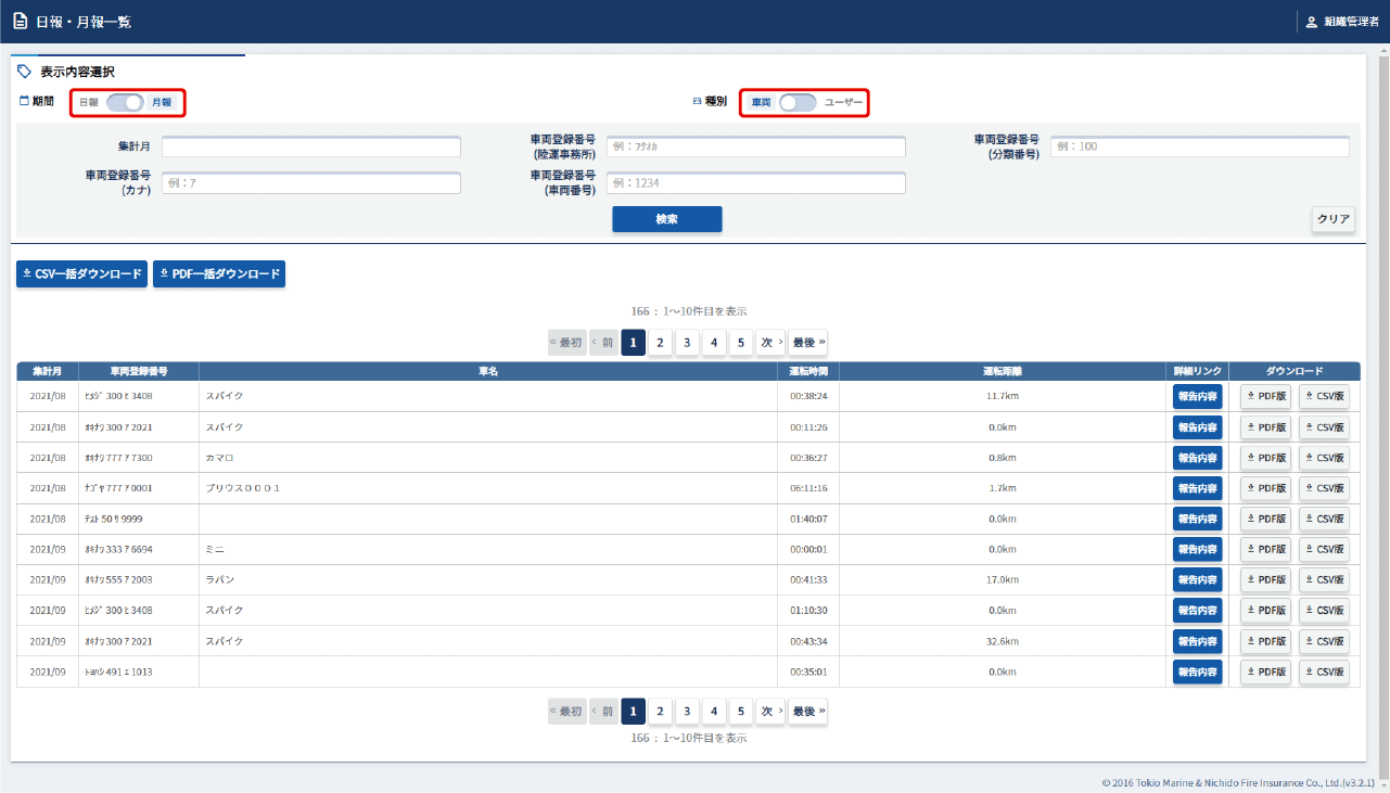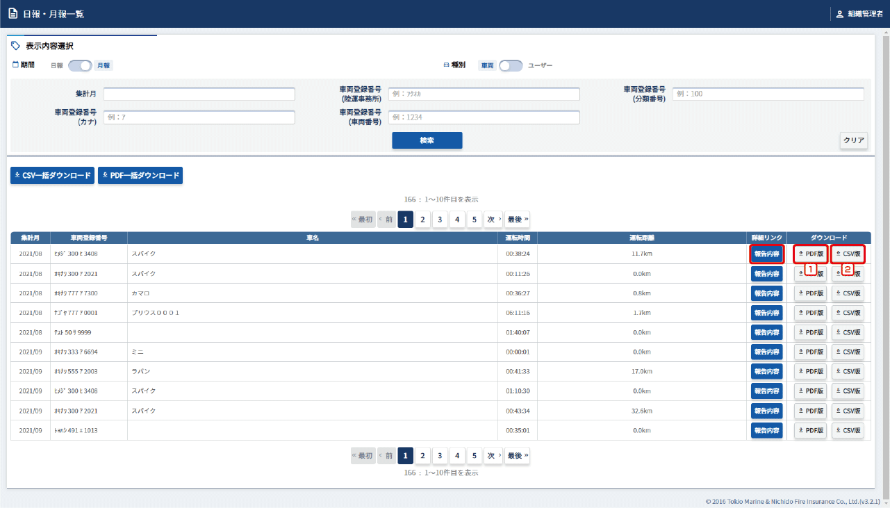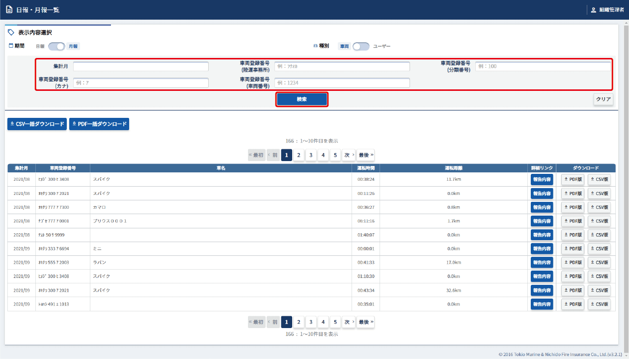 日報・月報一覧画面(日報・月報一覧画面を表示する)でタブを【月報】、【車両】に切り替えます。