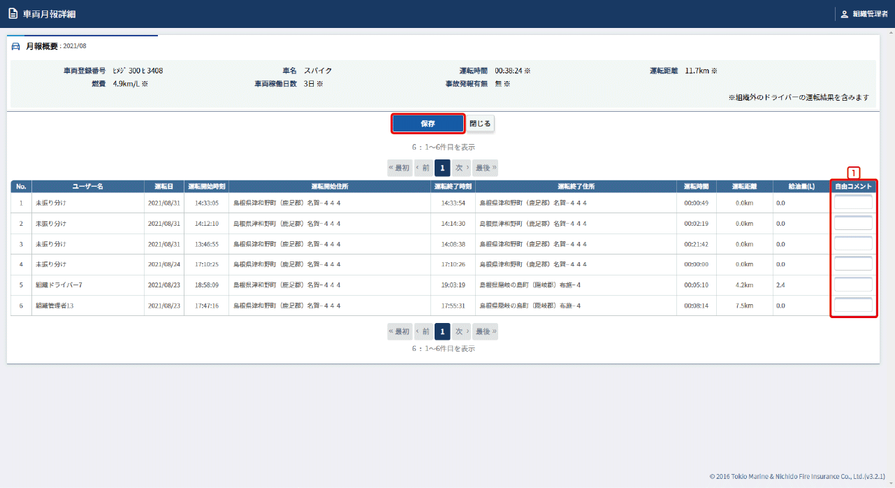車両月報詳細画面が表示されます。自由コメントを入力し、【保存】をクリックします。