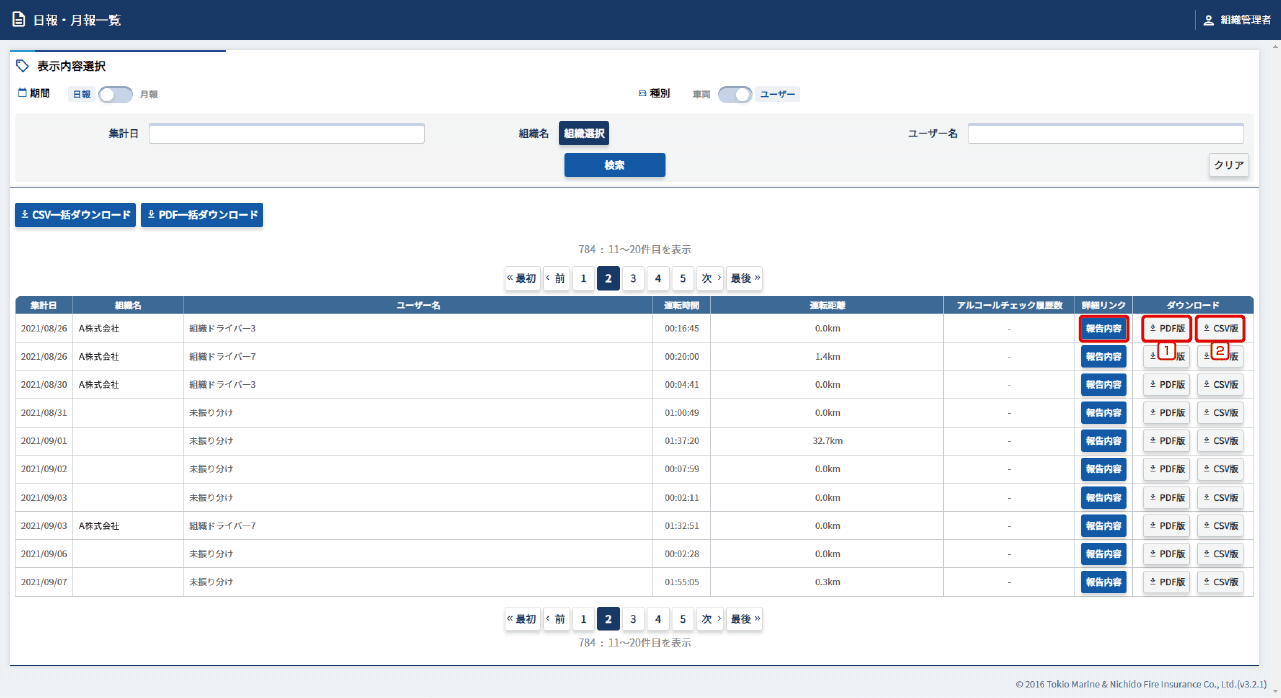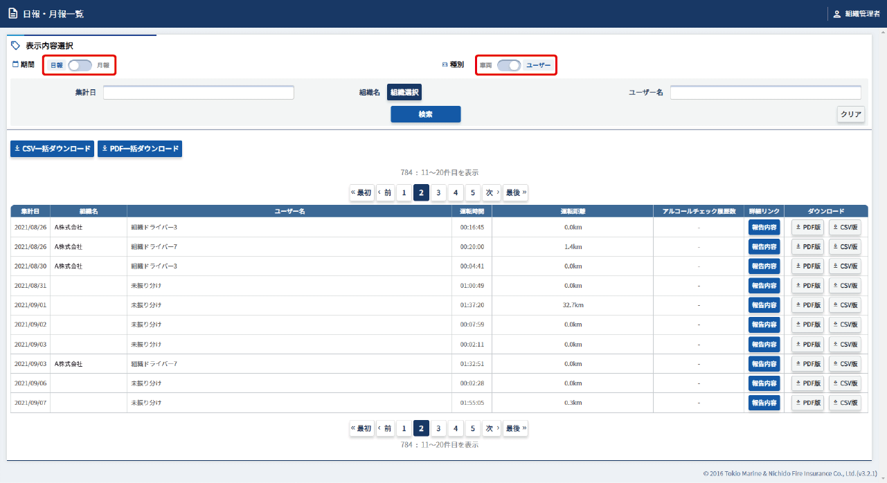 日報・月報一覧画面(日報・月報一覧画面を表示する)でタブを【日報】、【ユーザー】に切り替えます。