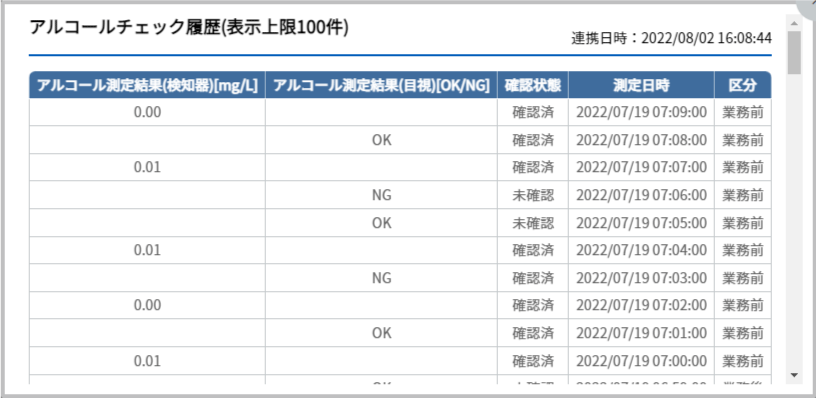 アルコールチェック履歴 【履歴】をクリックするとアルコールチェック履歴を表示