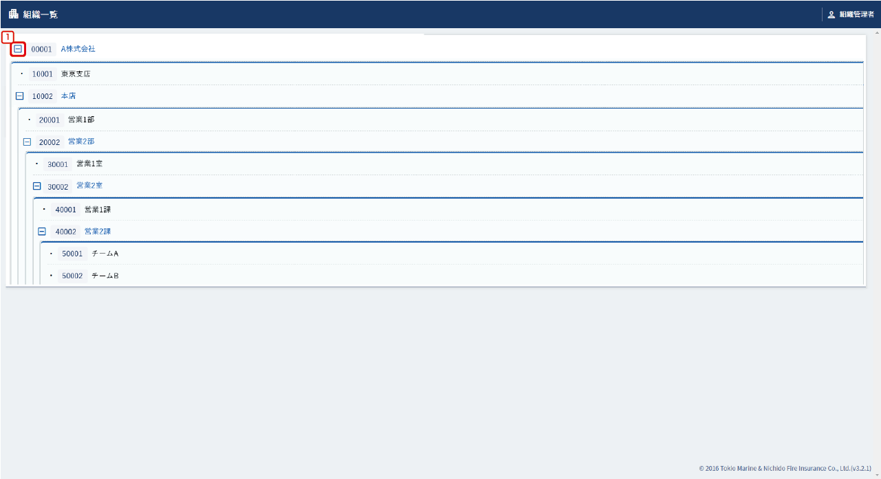 組織一覧画面を表示する 左メニューの【各種設定】の中の【組織一覧】をクリックします。 組織一覧画面が表示されます。 No. 項目 内容 +/- ボタン +ボタンをクリックすると、下の階層が表示されます。-ボタンをクリックすると、表示している階層を閉じます。