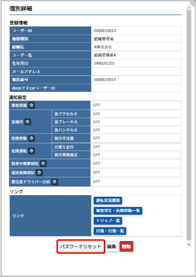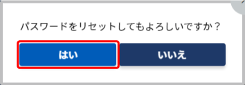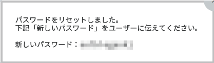 ユーザーのパスワードをリセットする Note: ご自身のパスワードはリセットできません。マイアカウントメニューから変更してください(パスワード変更) 個別詳細画面(個別詳細画面を表示する)で【パスワードリセット】をクリックします。 【はい】をクリックすると、新しいパスワードが表示されます。パスワードをリセットしたユーザーにメールアドレスが登録されている場合は、そのメールアドレスに確認メールが送信されます。 送信される確認メールの例 メールアドレスを登録していないアカウントのパスワードをリセットした場合は、画面に表示されたパスワードをお知らせください。