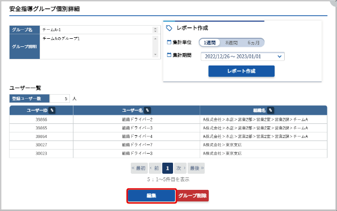 安全指導グループ個別詳細画面(安全指導グループ個別詳細画面を表示する)で【編集】をクリックします。
