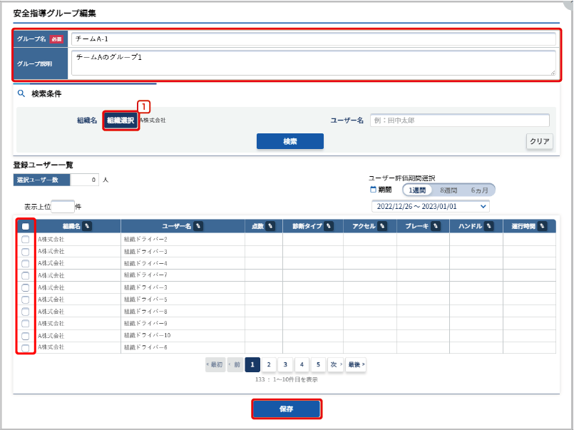 グループ名、グループ説明を入力し、全選択チェックボックス、または登録したいユーザーの選択チェックボックスにチェックを入れ、【保存】をクリックします。