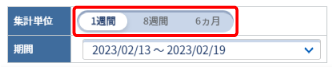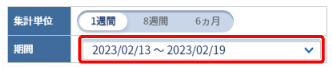 集計単位と集計期間を選択する 評価結果レポートの集計単位と集計期間を選択します。 安全指導グループ個別詳細画面(安全指導グループ個別詳細画面を表示する)の表示内容選択の集計単位で【1週間】【8週間】【6ヵ月】のいずれかを選択します。 集計期間を選択し、【OK】をクリックします。 1週間の場合 選択した日を含む月曜日~日曜日の1週間が選択されます。 8週間の場合 選択した週を最終週とした8週間が選択されます。 6ヵ月の場合 選択した月を最終月とした6ヵ月間が選択されます。
