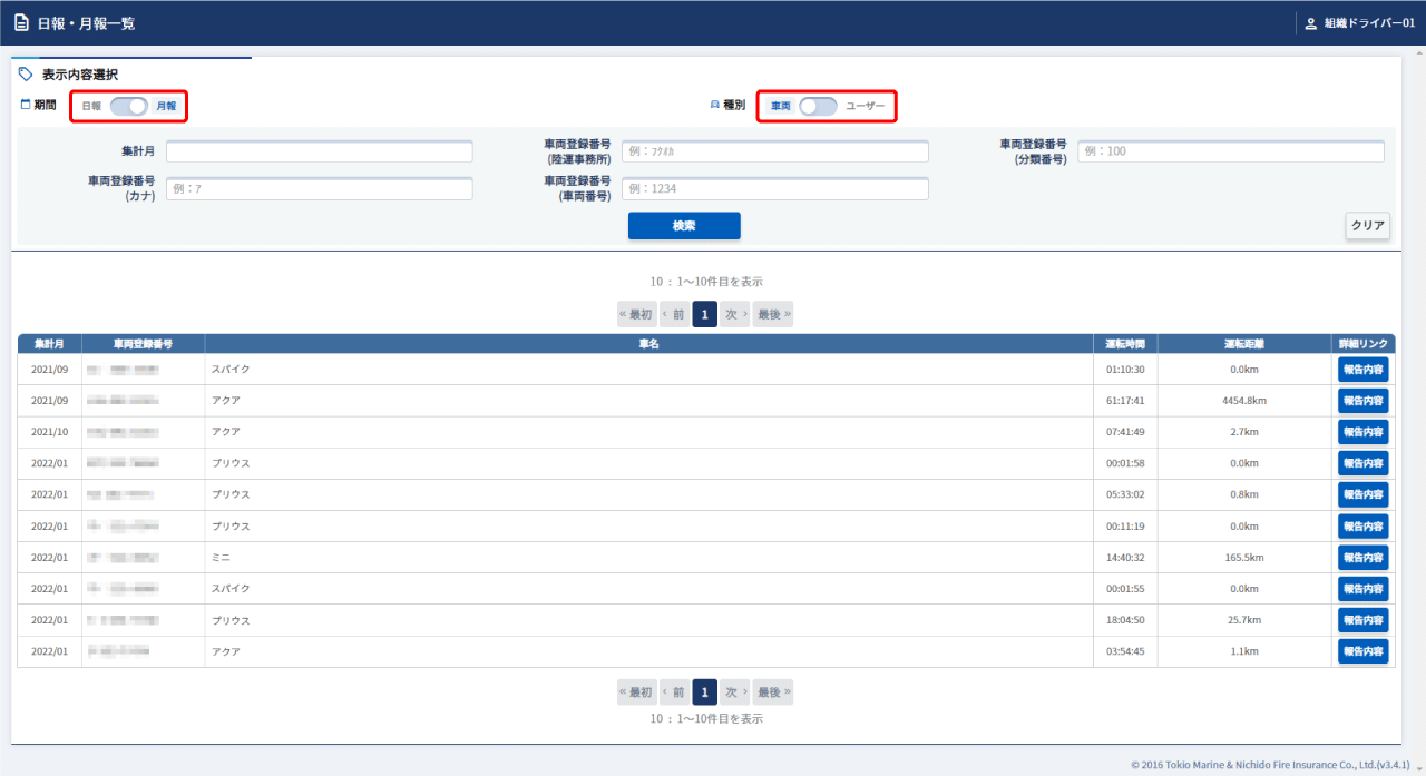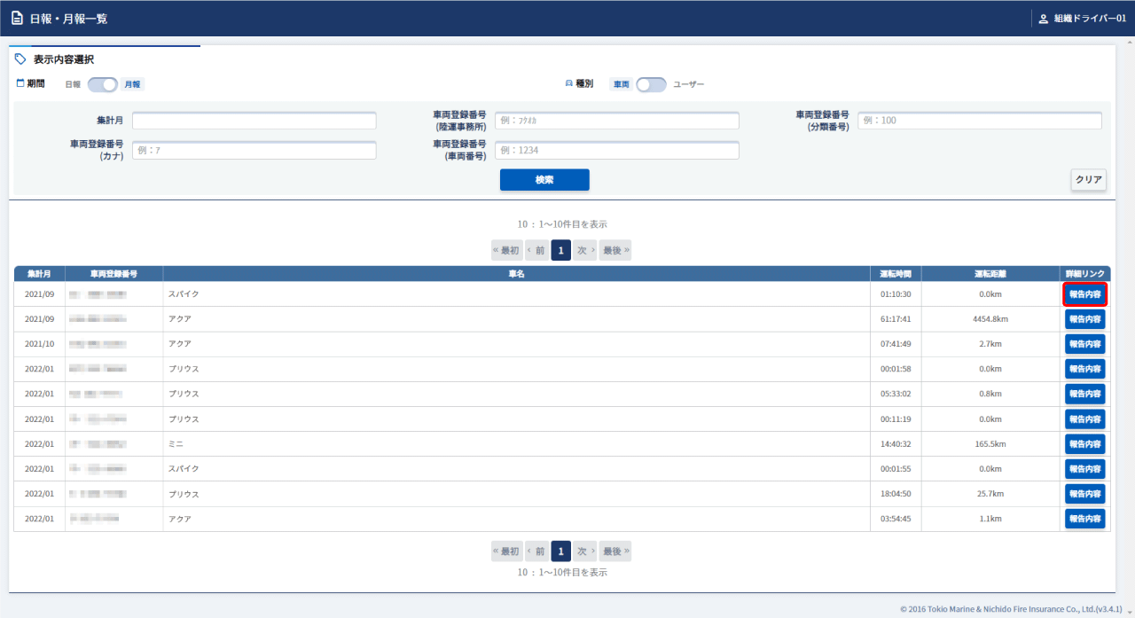 日報・月報一覧画面(日報・月報一覧画面を表示する)でタブを【月報】、【車両】に切り替えます。