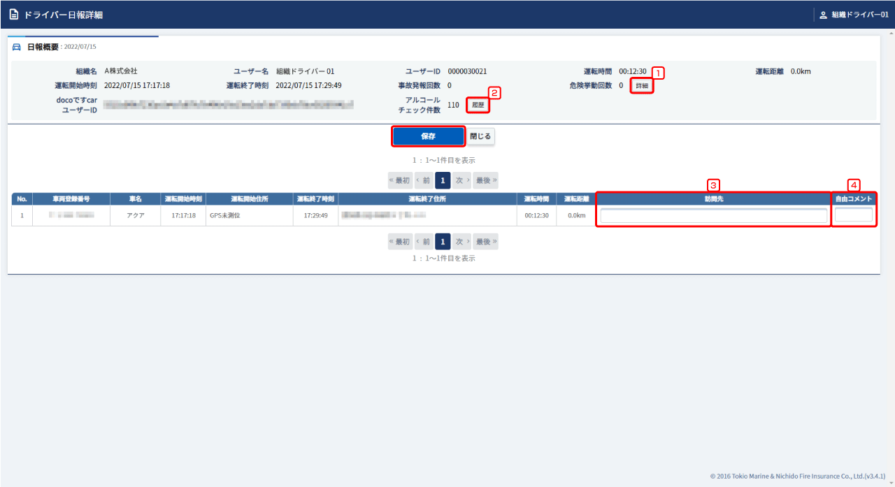 ドライバー日報詳細画面が表示されます。訪問先、自由コメントを入力し、【保存】をクリックします。