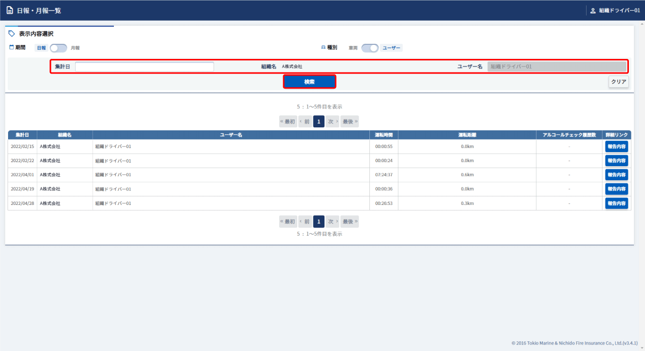 日報・月報一覧画面(日報・月報一覧画面を表示する)でタブを【日報】、【ユーザー】に切り替えます。